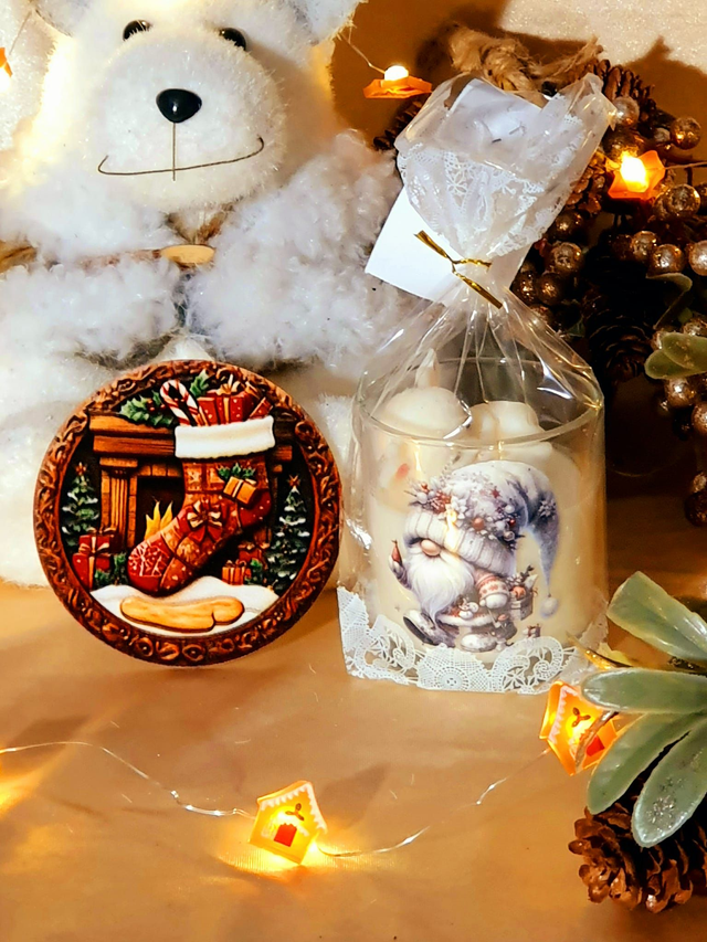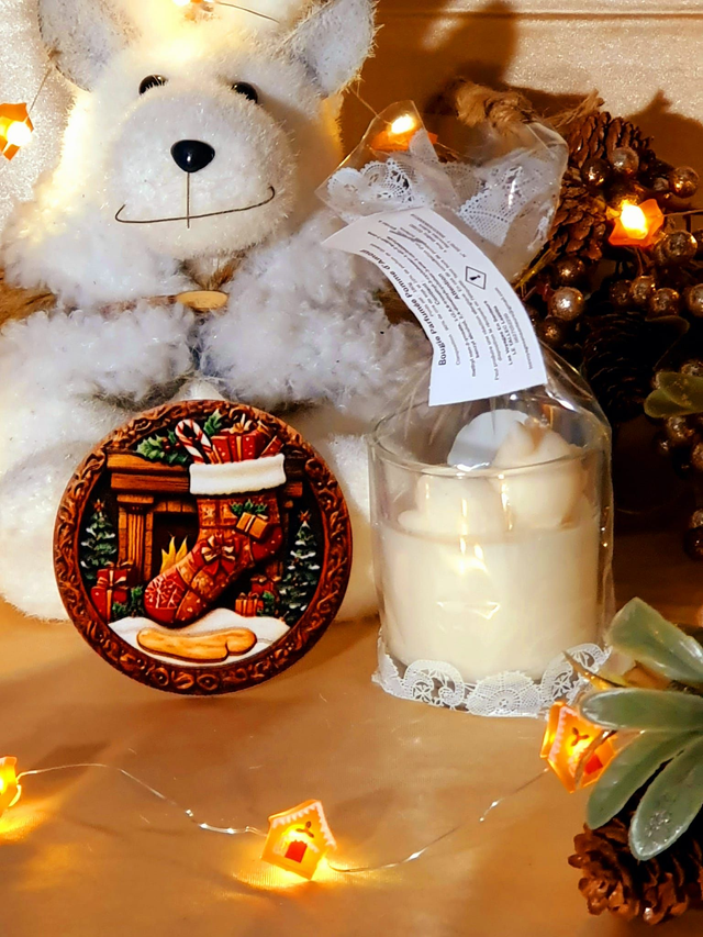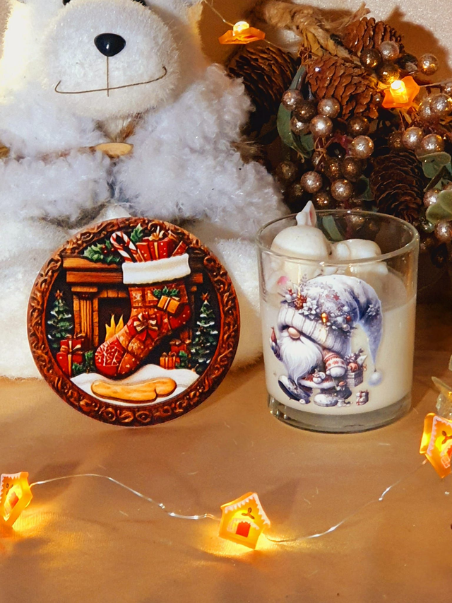 Bougie fournie avec un dessous de verre de Noël en bois (modèle aléatoire selon le stock disponible)