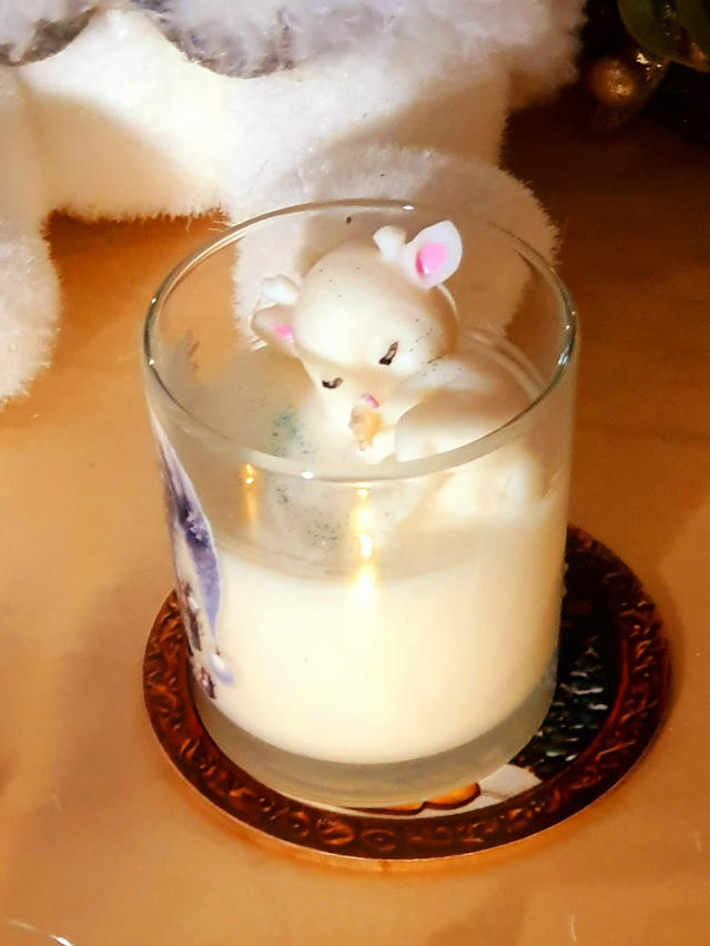 Bougie coulée dans un pot aux couleurs de noël et décorée d'une biche en cire peinte à la main, avec des crayons de cires, le tout saupoudré de paillettes biodégradables.