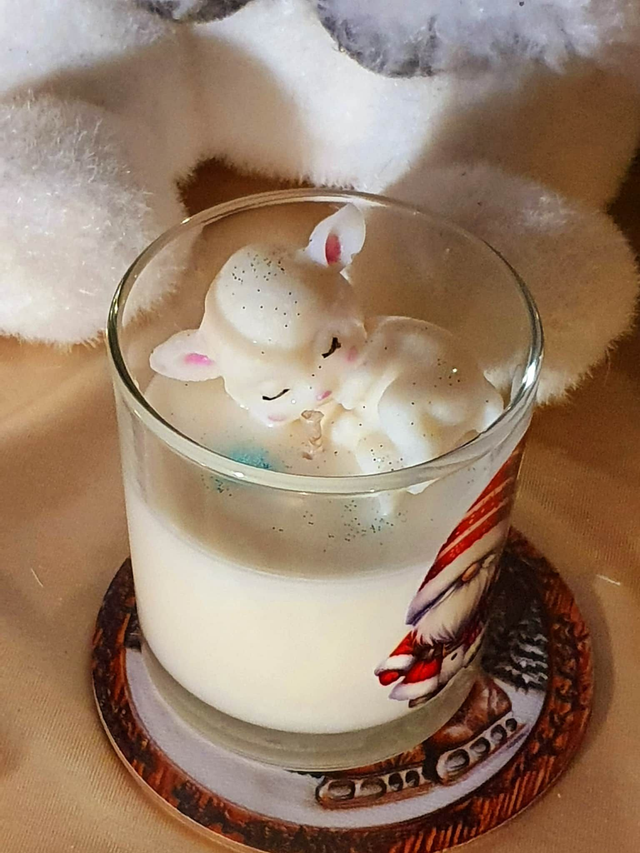 Bougie coulée dans un pot aux couleurs de Noël avec comme décoration une biche peinte à la main, avec des crayons de cires, le tout saupoudré de paillettes biodégradables.